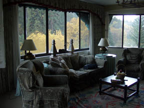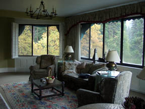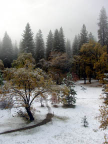 The image on the right is the view out of one of our windows. The sitting room had five large windows providing 180 degrees of views of Yosemite. It also had a fireplace which we enjoyed during the park's first snowfall of the 2001-2002 winter season. |