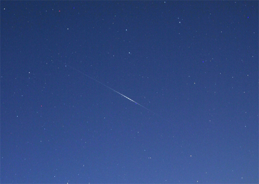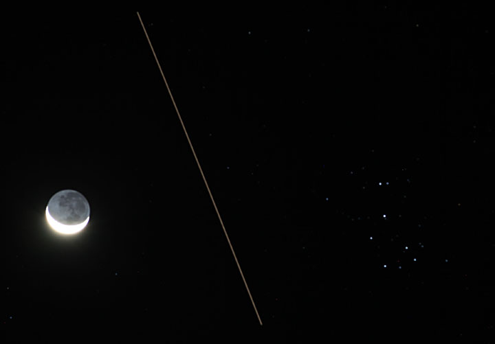International Space Station passing between crescent moon and the Pleiades star cluster