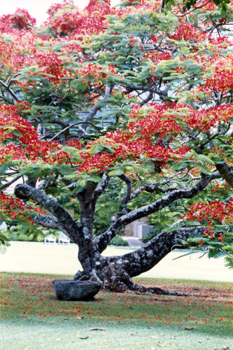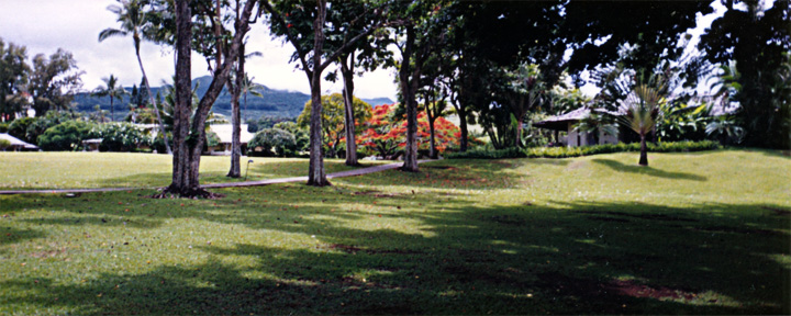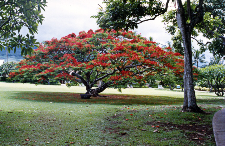 Hana Ranch (www.hotelhanamaui.com) sits on the east shore of Maui, remote and secluded from the usual tourist hotels that abound on the western side of the island. To reach it requires a trek of 50 miles over the Hana "highway" - a winding, twisting, 2-lane road that narrows to one lane in numerous places. The trip, though only 50 miles, can take as much as 2 hours. On the way, you pass through rain forests, past waterfalls, and along open areas that offer incredible views of the ocean. In addition to traditional hotel rooms, the Hana Ranch also offers cabins that sit on the edge of the property overlooking the ocean. The grounds are meticulously maintained and feature a wide variety of fragrant and flowering plants, trees, and other foliage. The "flame trees" or Royal Poinciana trees in these pictures are so vivid, they look as though someone painted them.
